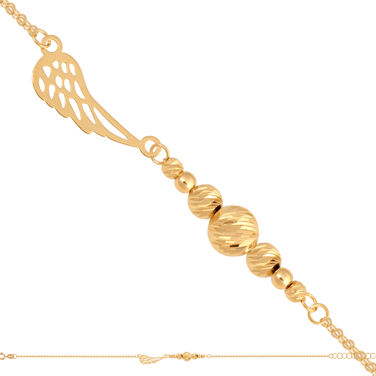 uwagi: Bransoletka z dwóch łańcuszków o ankrowym splocie, ozdobionych błyszczącymi kuleczkami i skrzydełkiem. Możliwość regulacji do 17 cm.