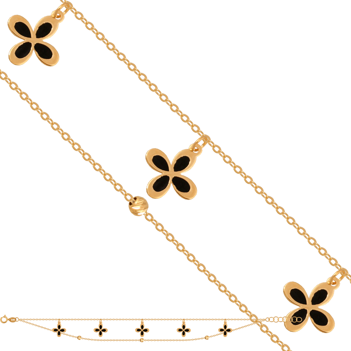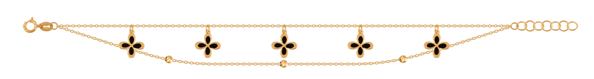 uwagi: Bransoletka z dwóch ankrowych łańcuszków, ozdobionych kuleczkami i kwiatuszkami z czarną emalią. Możliwość regulacji do 17 cm.