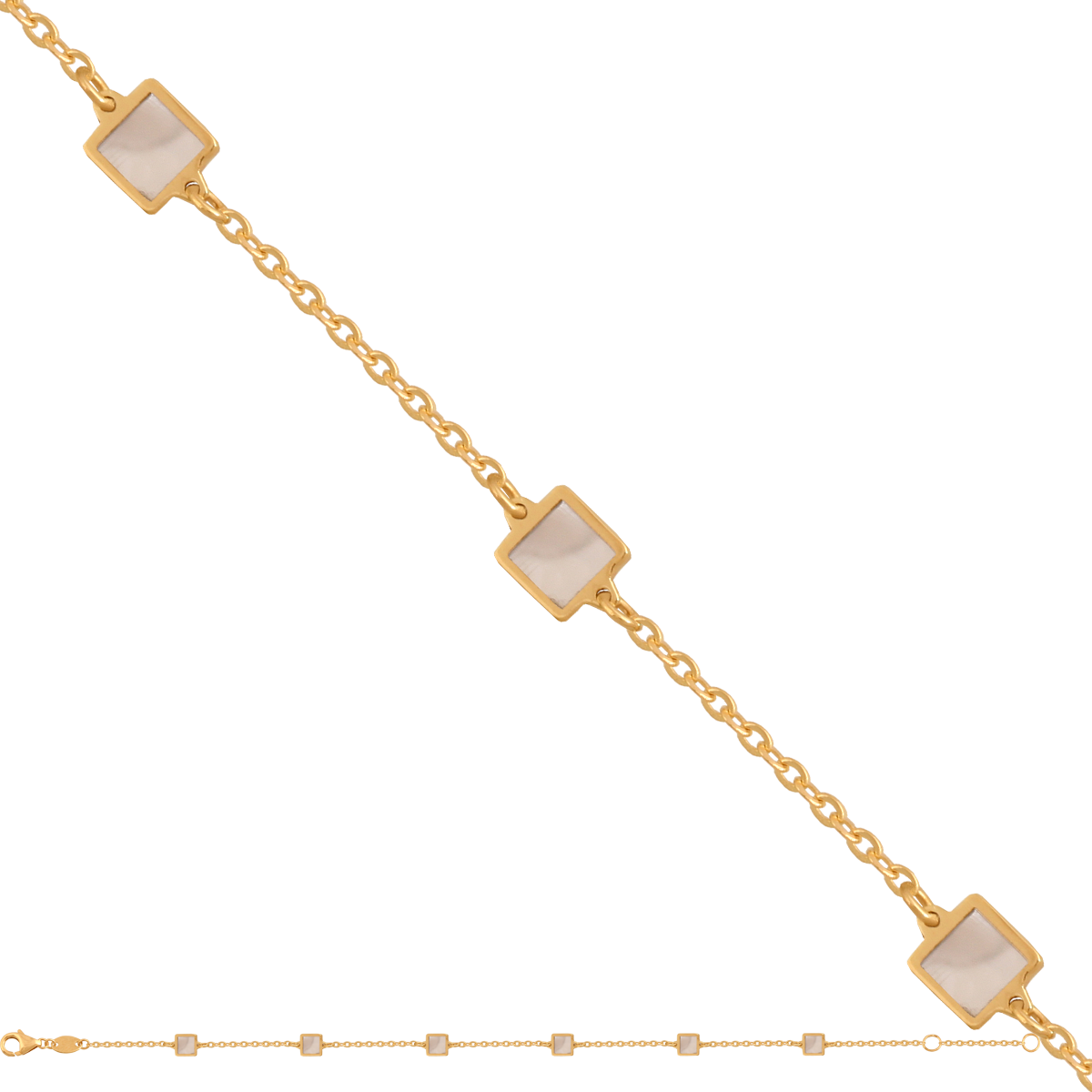 uwagi: łańcuszkowa bransoletka składająca się z 3 elementów wypełnionych masą perłową, możliwość regulacji 22/24 cm