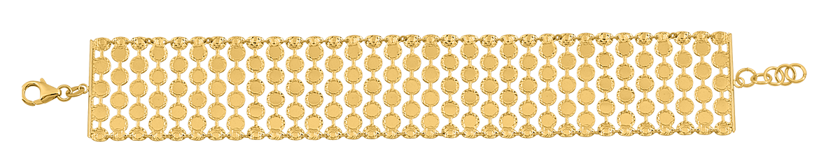 uwagi: Efektowna bransoleta z ruchomych, blaszkowych elementów, zdobionych błyszczącymi nacięciami. Możliwość regulacji długości do 18 cm.