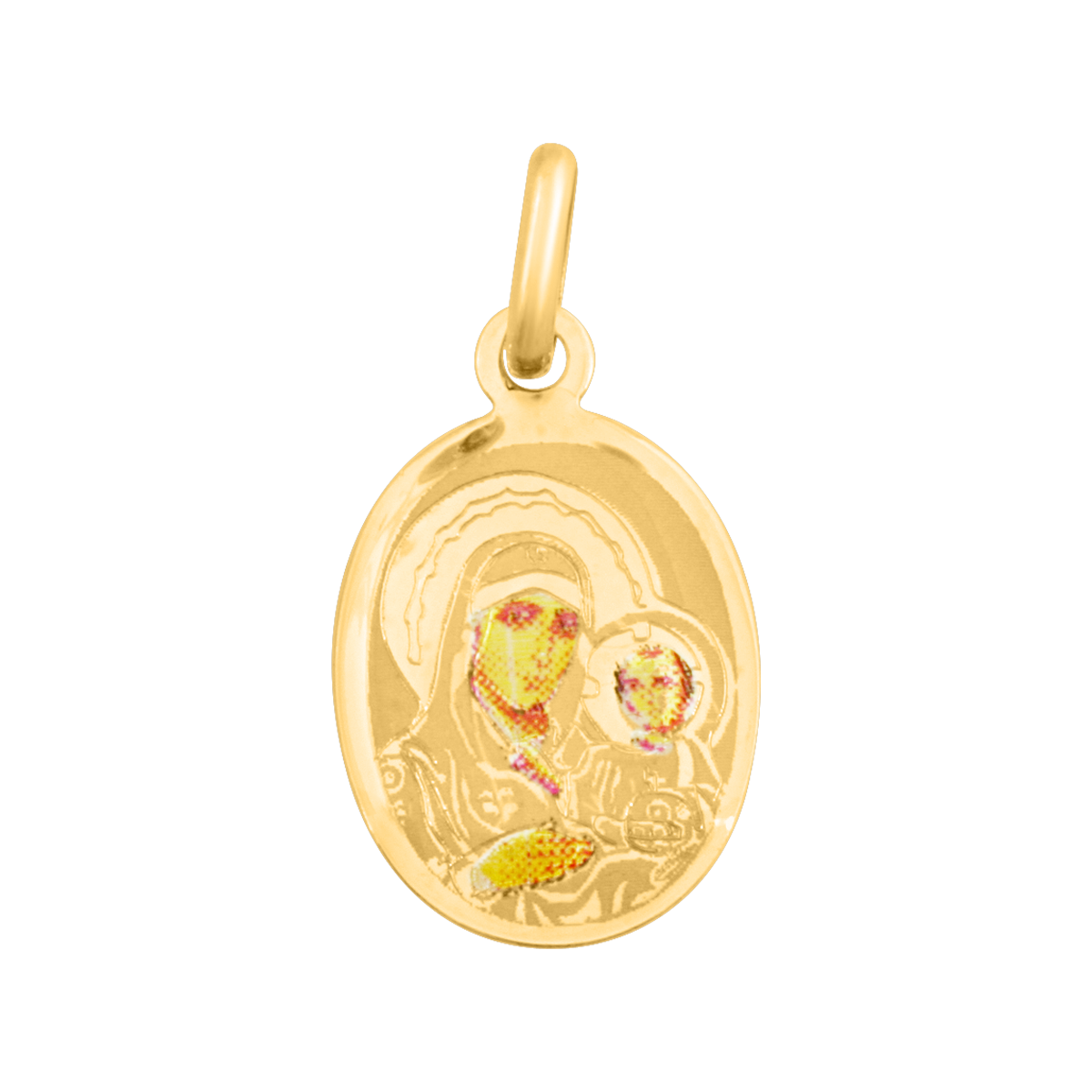 uwagi: Medalik z emalią z wizerunkiem Matki Boskiej z Dzieciątkiem. Z tyłu pełny z wzorem plastra miodu.