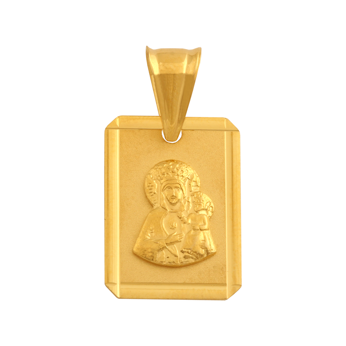 uwagi: Prostokątny medalik z wizerunkiem Matki Boskiej Częstochowskiej na błyszczącym tle z różnymi grawerami na około. Tył pełny.