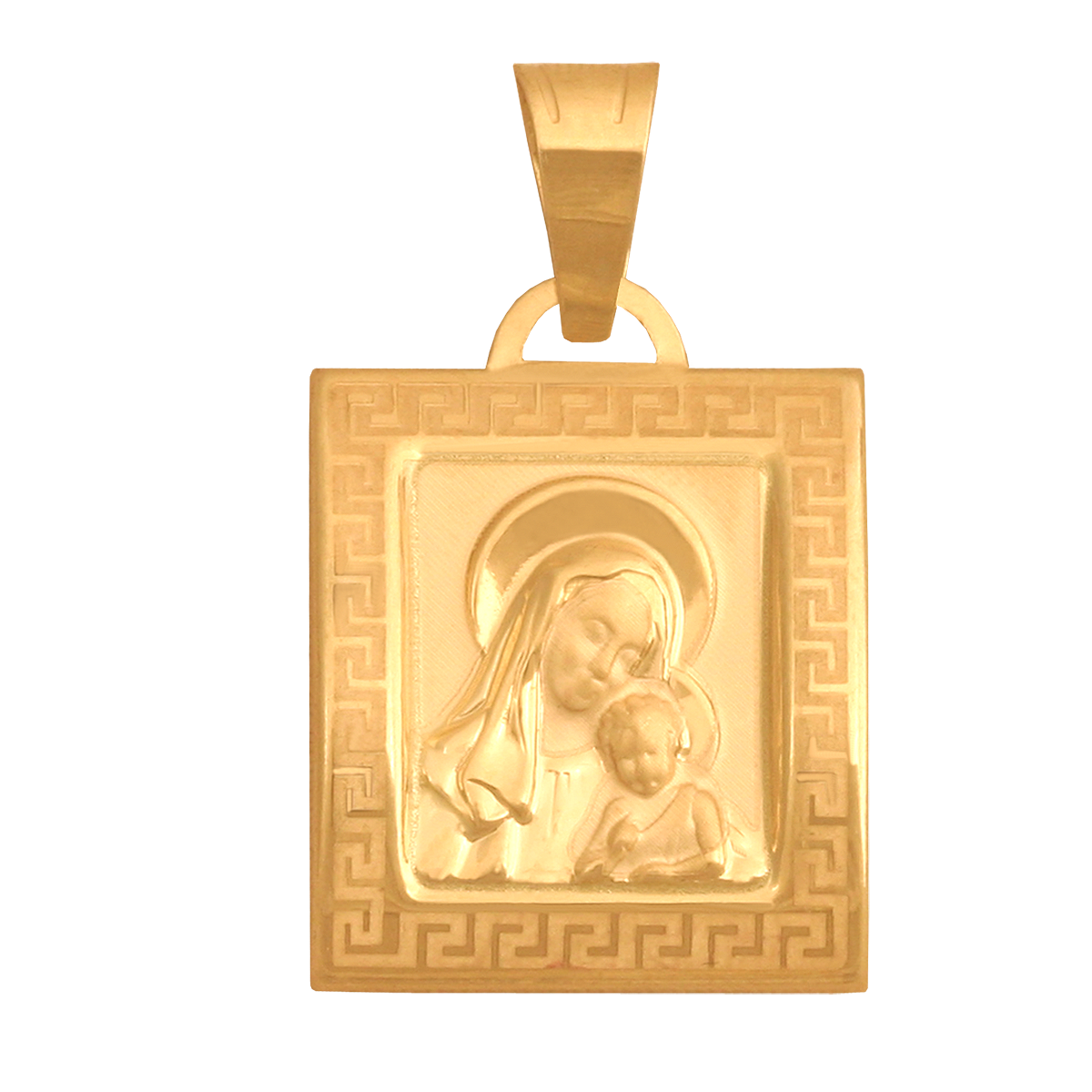 ID: #12325 symbol: Mv024 EAN: 5900025123256 szerokość: 14 mm wysokość: 16 mm uwagi: Medalik z wizerunkiem Matki Boskiej z Dzieciątkiem.Rameczka ozdobiona greckim wzorem.Z tyłu pełny.