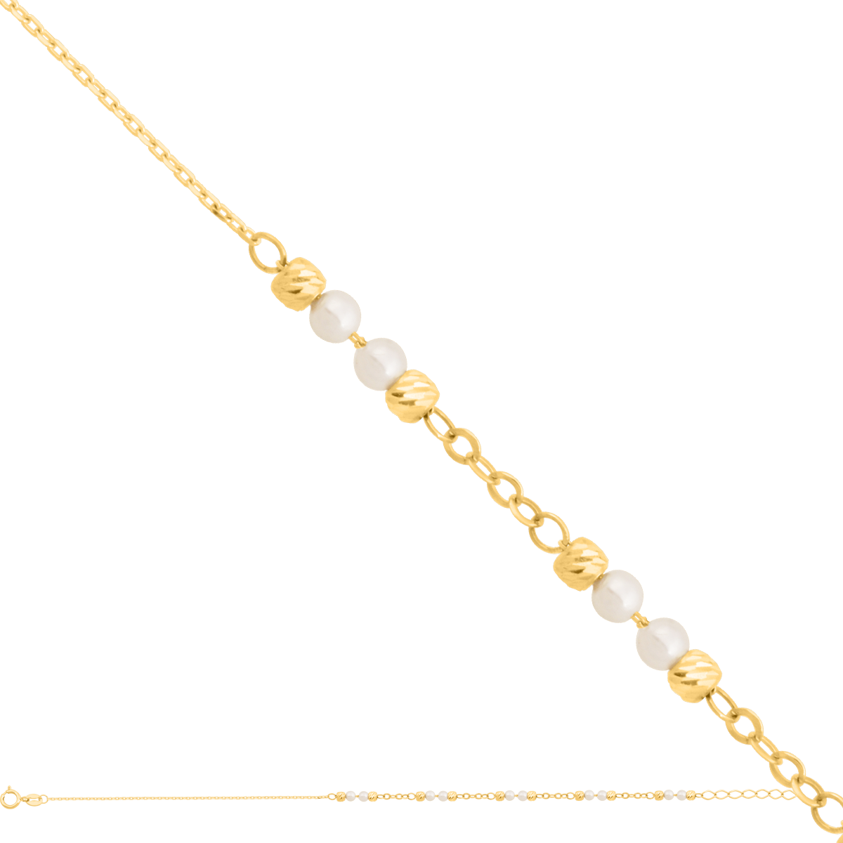 uwagi: Modna bransoletka o ankrowym splocie z perełkami i grawerowanymi złotymi kuleczkami. Możliwość regulacji do 17cm.