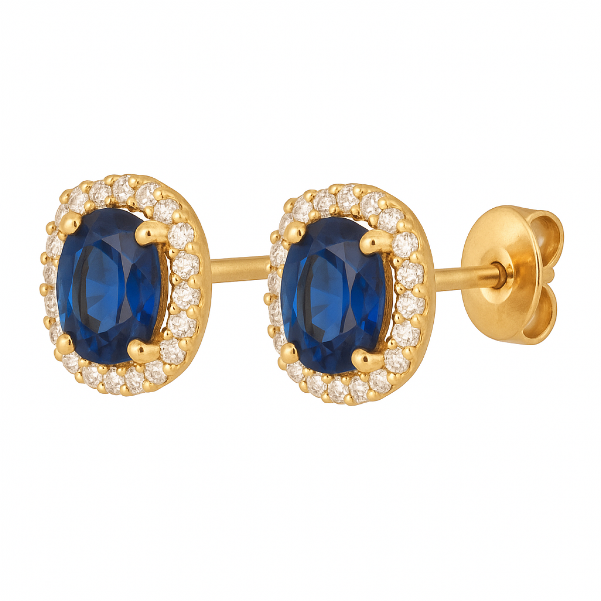 uwagi: Kolczyki z owalnym kamieniem w kolorze szafiru, otoczony wianuszkiem cyrkonii. Wymiary dotyczą centralnego kamienia.