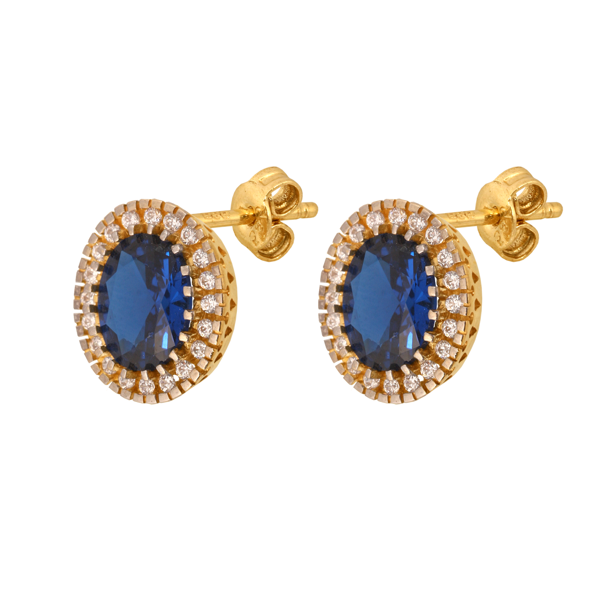 uwagi: Kolczyki z dużym owalnym kamieniem w kolorze szafiru otoczonym wianuszkiem cyrkonii.