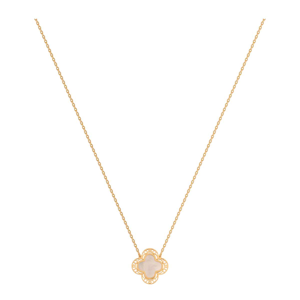 uwagi: łańcuszkowy naszyjnik z 1 elementem e postaci koniczyny wypełnionej masą perłową ze zdobieniami wycinanymi laserowo, możliwośc regulacji 41/44 cm