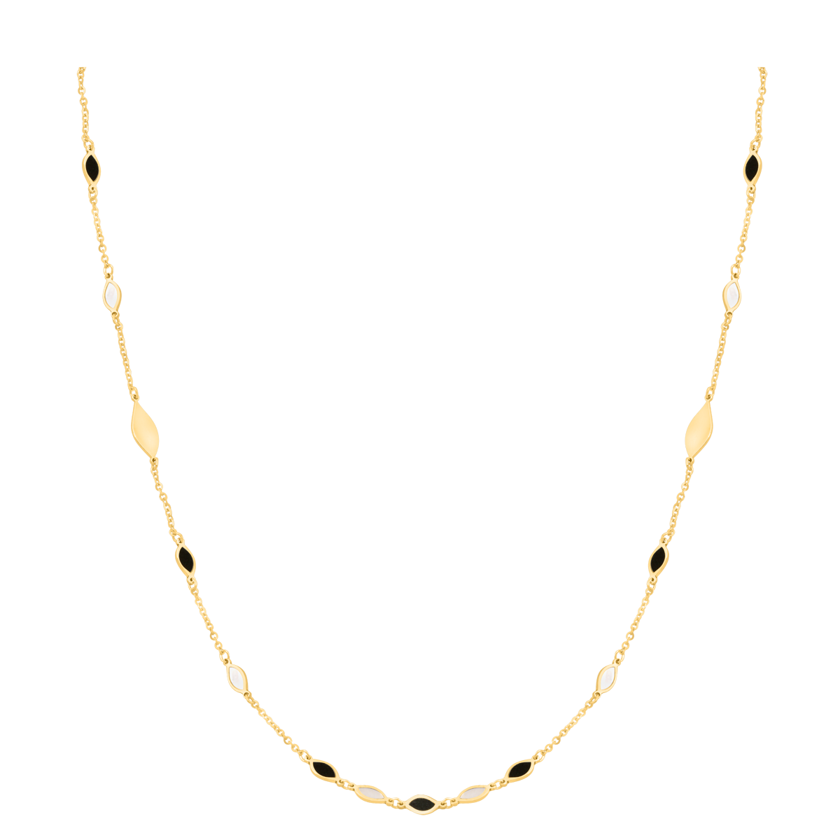 uwagi: złoty naszyjnik z 15 elementami - łezkami wypełnionymi na przemian masą perłową i czarną emalią, długość 45/42cm