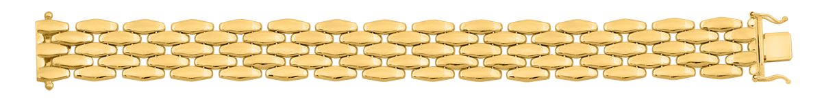 ID: #25336 symbol: 25336 EAN: 5900025253366 długość: 20 cm szerokość: 17.3 mm uwagi: Efektowna bransoleta, z łączonych elementów, jak bransoletka zegarka. Spód gładki, pełny.
