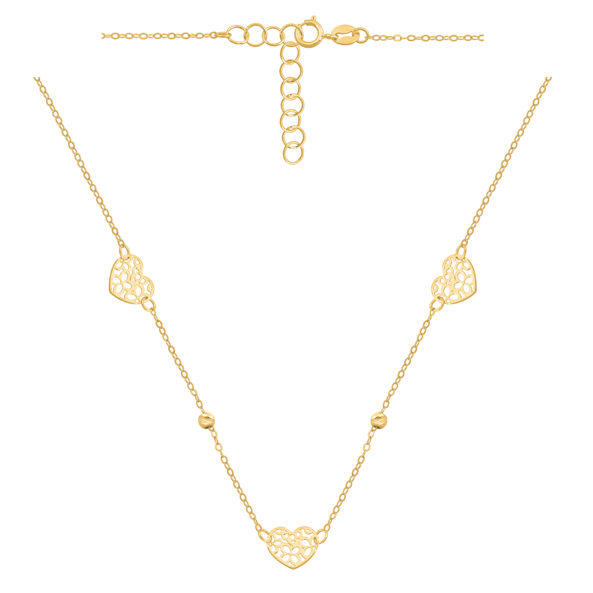 uwagi: Naszyjnik łańcuszkowy z 3 ażurowymi serduszkami i 2 kuleczkami. Możliwość regulacji do 42cm