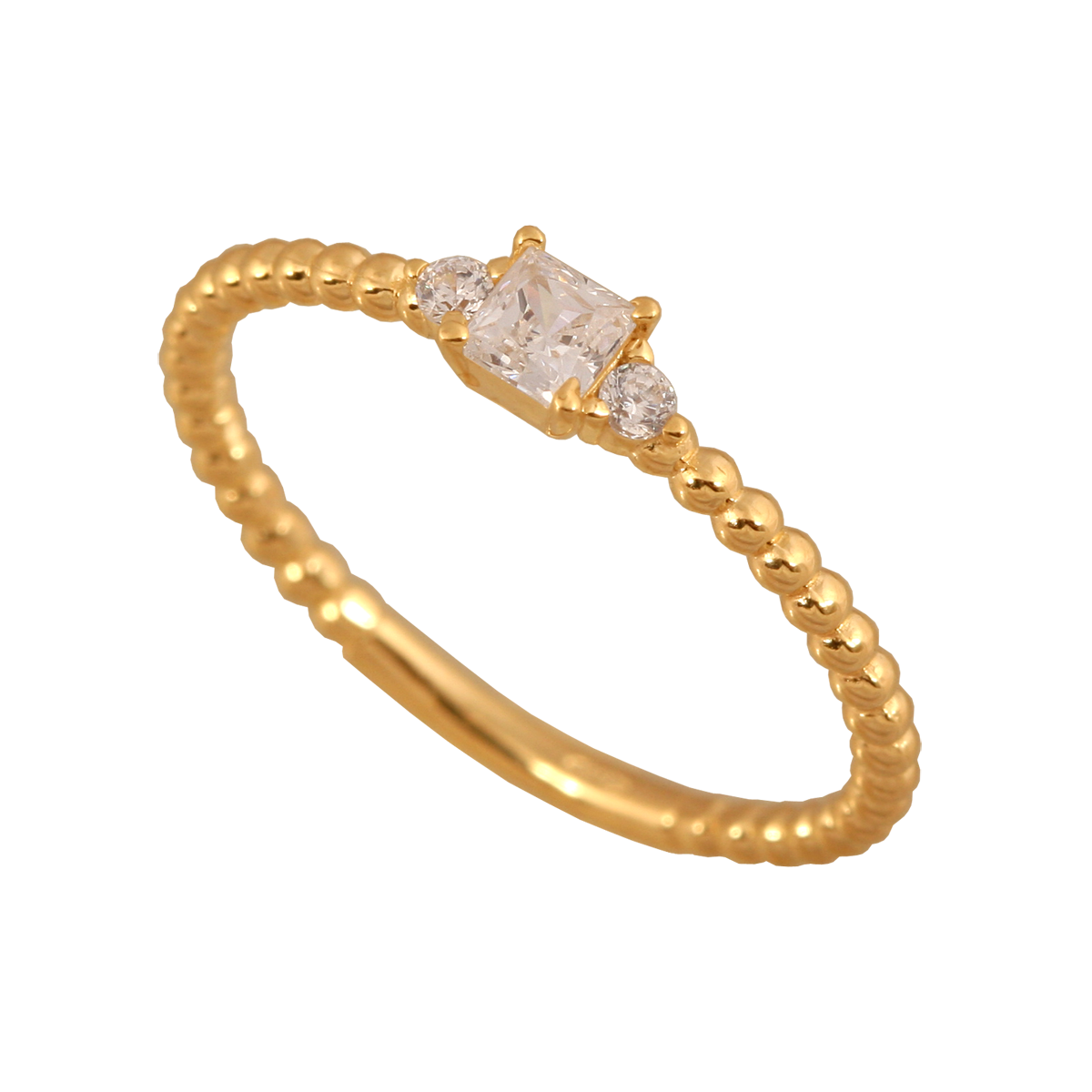 ID: #56138 symbol: Pi472 EAN: 5900025561386 uwagi: Obrączka pierścionka z kuleczek zdobiona prostokątną cyrkonią i dwoma okrągłymi. średnica: 19 mm