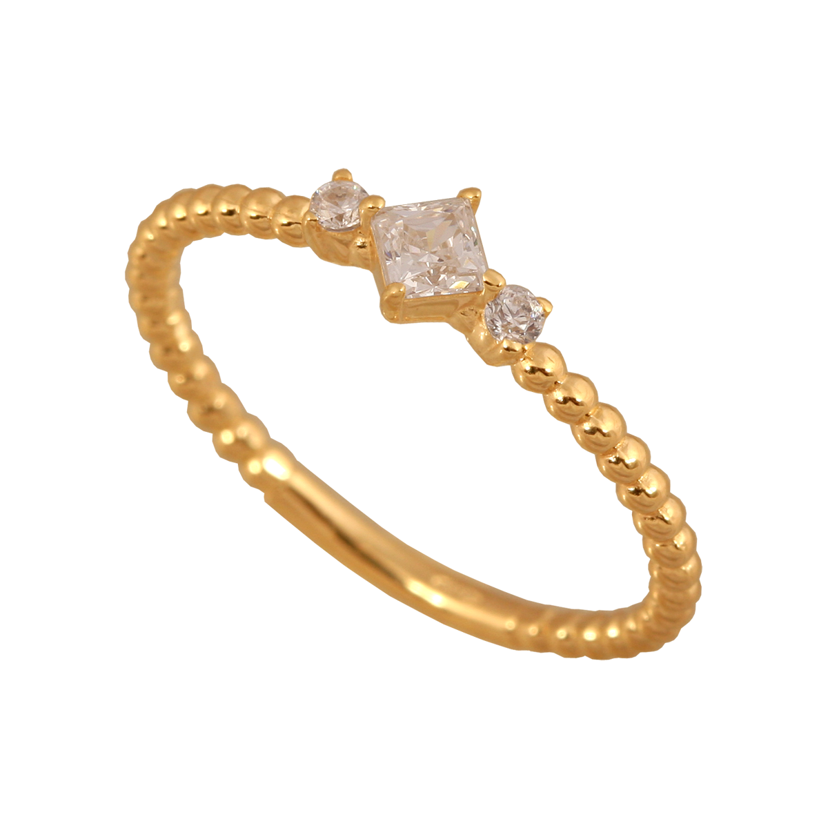 ID: #61376 symbol: Pi473 EAN: 5900025613764 uwagi: Obrączka pierścionka z kuleczek zdobiona cyrkonią w kształcie rombu i dwoma okrągłymi. średnica: 16 mm
