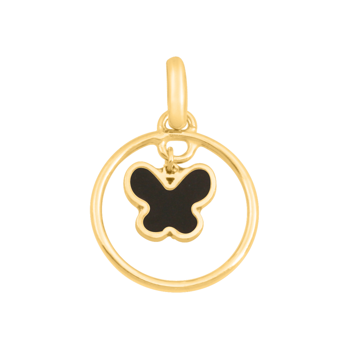 ID: #33399 symbol: 33399 EAN: 5900025333990 uwagi: Wisiorek z wiszącym elementem motylkiem wypełnionym czarną emalią. średnica: 12.5 mm